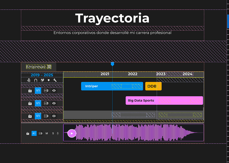Para ello, se tomaron decisiones basadas en su entorno cotidiano: la navegación se inspira en una línea de tiempo de edición, los cursores replican los utilizados en software profesional y la barra de scroll funciona como un timeline, reforzando la metáfora del proceso de edición.
